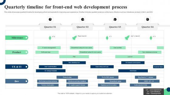 This slide showcases quarterly timeline for developing a front-end website for improving user experience. It further includes quarterly analysis on the basis of factors such as milestones, product, UX and UI, and DEV. Pitch your topic with ease and precision using this Quarterly Timeline For Front End Web Development Process Ppt File Clipart Pdf. This layout presents information on Milestones, Product, IT Store Management. It is also available for immediate download and adjustment. So, changes can be made in the color, design, graphics or any other component to create a unique layout. This slide showcases quarterly timeline for developing a front-end website for improving user experience. It further includes quarterly analysis on the basis of factors such as milestones, product, UX and UI, and DEV.