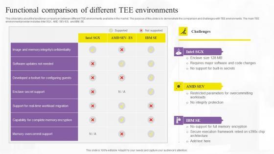 This slide talks about the functional comparison between different TEE environments available in the market. The purpose of this slide is to demonstrate the comparison and challenges with TEE environments. The main TEE environment provider includes intel SGX, AMD SEV-ES, and IBM SE. Slidegeeks has constructed Functional Comparison Of Different Tee Secure Computing Framework Diagrams Pdf after conducting extensive research and examination. These presentation templates are constantly being generated and modified based on user preferences and critiques from editors. Here, you will find the most attractive templates for a range of purposes while taking into account ratings and remarks from users regarding the content. This is an excellent jumping-off point to explore our content and will give new users an insight into our top-notch PowerPoint Templates. This slide talks about the functional comparison between different TEE environments available in the market. The purpose of this slide is to demonstrate the comparison and challenges with TEE environments. The main TEE environment provider includes intel SGX, AMD SEV-ES, and IBM SE.