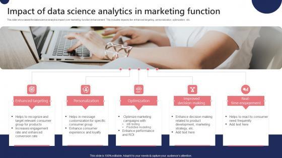 This slide showcases the data science analytics impact over marketing function enhancement. This includes impacts like enhanced targeting, personalization, optimization, etc. Showcasing this set of slides titled Impact Of Data Science Analytics In Marketing Function Ppt Ideas Templates Pdf. The topics addressed in these templates are Enhanced Targeting, Personalization, Optimization. All the content presented in this PPT design is completely editable. Download it and make adjustments in color, background, font etc. as per your unique business setting. This slide showcases the data science analytics impact over marketing function enhancement. This includes impacts like enhanced targeting, personalization, optimization, etc.