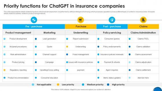 This slide represents the details related to functions which hold utmost priority to be performed by artificial intelligence technology which possesses capability to produce different types of content in insurance sector. It includes details related to activities related to product management etc. Welcome to our selection of the Implementing ChatGpt In Insurance Priority Functions For ChatGpt In Insurance ChatGpt SS V. These are designed to help you showcase your creativity and bring your sphere to life. Planning and Innovation are essential for any business that is just starting out. This collection contains the designs that you need for your everyday presentations. All of our PowerPoints are 100Percent editable, so you can customize them to suit your needs. This multi-purpose template can be used in various situations. Grab these presentation templates today. This slide represents the details related to functions which hold utmost priority to be performed by artificial intelligence technology which possesses capability to produce different types of content in insurance sector. It includes details related to activities related to product management etc.