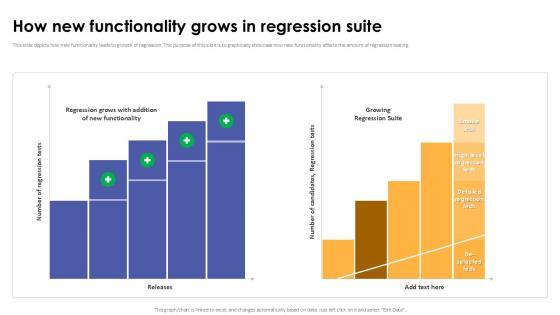 This slide depicts how new functionality leads to growth of regression. The purpose of this slide is to graphically showcase how new functionality effects the amount of regression testing. The How New Functionality Grows In Regression Suite Corrective Regression Testing Ppt Sample is a compilation of the most recent design trends as a series of slides. It is suitable for any subject or industry presentation, containing attractive visuals and photo spots for businesses to clearly express their messages. This template contains a variety of slides for the user to input data, such as structures to contrast two elements, bullet points, and slides for written information. Slidegeeks is prepared to create an impression. This slide depicts how new functionality leads to growth of regression. The purpose of this slide is to graphically showcase how new functionality effects the amount of regression testing.