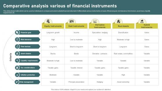This slide shows matrix which can be used by individuals to compare and select suitable financial instrument. It differentiate various instruments on basis of financial goal, risk tolerance, time horizon, asset class, liquidity requirement, etc. Present like a pro with Comparative Analysis Various Of Investment Banking Simplified Functions Fin SS V. Create beautiful presentations together with your team, using our easy-to-use presentation slides. Share your ideas in real-time and make changes on the fly by downloading our templates. So whether you are in the office, on the go, or in a remote location, you can stay in sync with your team and present your ideas with confidence. With Slidegeeks presentation got a whole lot easier. Grab these presentations today. This slide shows matrix which can be used by individuals to compare and select suitable financial instrument. It differentiate various instruments on basis of financial goal, risk tolerance, time horizon, asset class, liquidity requirement, etc.