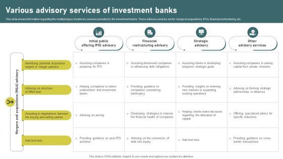 This slide shows information regarding the multiple types of advisory services provided by the investment banks. These advisory services are for merger and acquisitions, IPOs, financial restructuring, etc. Crafting an eye-catching presentation has never been more straightforward. Let your presentation shine with this tasteful yet straightforward Various Advisory Services Of Investment Banking Simplified Functions Fin SS V template. It offers a minimalistic and classy look that is great for making a statement. The colors have been employed intelligently to add a bit of playfulness while still remaining professional. Construct the ideal Various Advisory Services Of Investment Banking Simplified Functions Fin SS V that effortlessly grabs the attention of your audience Begin now and be certain to wow your customers This slide shows information regarding the multiple types of advisory services provided by the investment banks. These advisory services are for merger and acquisitions, IPOs, financial restructuring, etc.