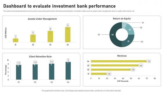 This slide shows dashboard which can be used to measure the performance of investment banking firm. It includes metrics such as assets under management, return on equity, total revenue, etc. Find highly impressive Dashboard To Evaluate Investment Bank Investment Banking Simplified Functions Fin SS V on Slidegeeks to deliver a meaningful presentation. You can save an ample amount of time using these presentation templates. No need to worry to prepare everything from scratch because Slidegeeks experts have already done a huge research and work for you. You need to download Dashboard To Evaluate Investment Bank Investment Banking Simplified Functions Fin SS V for your upcoming presentation. All the presentation templates are 100 percent editable and you can change the color and personalize the content accordingly. Download now This slide shows dashboard which can be used to measure the performance of investment banking firm. It includes metrics such as assets under management, return on equity, total revenue, etc.