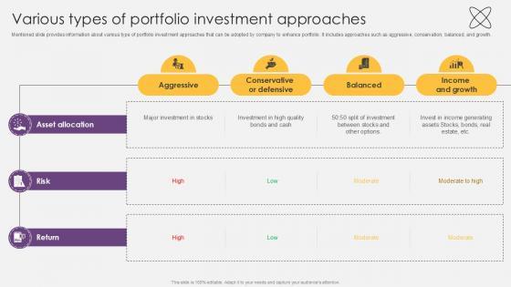 Mentioned slide provides information about various type of portfolio investment approaches that can be adopted by company to enhance portfolio.It includes approaches such as aggressive, conservation, balanced, and growth. From laying roadmaps to briefing everything in detail, our templates are perfect for you. You can set the stage with your presentation slides. All you have to do is download these easy to edit and customizable templates. Various Types Of Portfolio Investment Approaches Investment Fund PPT Template will help you deliver an outstanding performance that everyone would remember and praise you for. Do download this presentation today. Mentioned slide provides information about various type of portfolio investment approaches that can be adopted by company to enhance portfolio.It includes approaches such as aggressive, conservation, balanced, and growth.