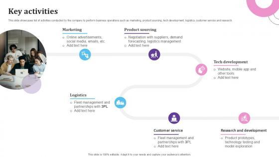 This slide showcases list of activities conducted by the company to perform business operations such as marketing, product sourcing, tech development, logistics, customer service and research. Get a simple yet stunning designed Key Activities E Commerce Platform For Furniture PPT Presentation BMC SS V. It is the best one to establish the tone in your meetings. It is an excellent way to make your presentations highly effective. So, download this PPT today from Slidegeeks and see the positive impacts. Our easy-to-edit Key Activities E Commerce Platform For Furniture PPT Presentation BMC SS V can be your go-to option for all upcoming conferences and meetings. So, what are you waiting for Grab this template today. This slide showcases list of activities conducted by the company to perform business operations such as marketing, product sourcing, tech development, logistics, customer service and research.