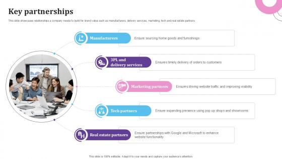This slide showcases relationships a company needs to build for brand value such as manufacturers, delivery services, marketing, tech and real estate partners. Present like a pro with Key Partnerships E Commerce Platform For Furniture PPT Slide BMC SS V. Create beautiful presentations together with your team, using our easy-to-use presentation slides. Share your ideas in real-time and make changes on the fly by downloading our templates. So whether you are in the office, on the go, or in a remote location, you can stay in sync with your team and present your ideas with confidence. With Slidegeeks presentation got a whole lot easier. Grab these presentations today. This slide showcases relationships a company needs to build for brand value such as manufacturers, delivery services, marketing, tech and real estate partners