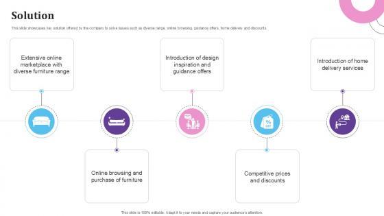 This slide showcases key solution offered by the company to solve issues such as diverse range, online browsing, guidance offers, home delivery and discounts. If your project calls for a presentation, then Slidegeeks is your go-to partner because we have professionally designed, easy-to-edit templates that are perfect for any presentation. After downloading, you can easily edit Solution E Commerce Platform For Furniture PPT Sample BMC SS V and make the changes accordingly. You can rearrange slides or fill them with different images. Check out all the handy templates This slide showcases key solution offered by the company to solve issues such as diverse range, online browsing, guidance offers, home delivery and discounts.