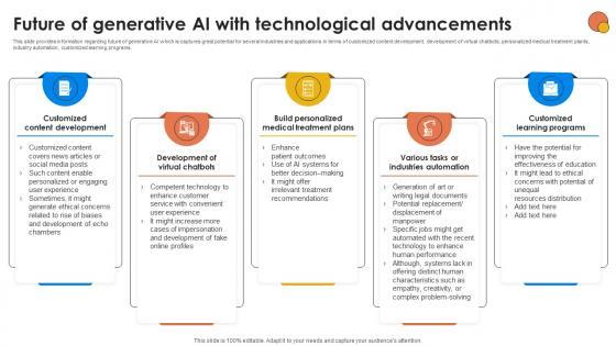 This slide provides information regarding future of generative AI which is captures great potential for several industries and applications in terms of customized content development, development of virtual chatbots, personalized medical treatment plants, industry automation, customized learning programs. If you are looking for a format to display your unique thoughts, then the professionally designed Future Of Generative AI With Technological Generative AI For Better Productivity AI SS V is the one for you. You can use it as a Google Slides template or a PowerPoint template. Incorporate impressive visuals, symbols, images, and other charts. Modify or reorganize the text boxes as you desire. Experiment with shade schemes and font pairings. Alter, share or cooperate with other people on your work. Download Future Of Generative AI With Technological Generative AI For Better Productivity AI SS V and find out how to give a successful presentation. Present a perfect display to your team and make your presentation unforgettable. This slide provides information regarding future of generative AI which is captures great potential for several industries and applications in terms of customized content development, development of virtual chatbots, personalized medical treatment plants, industry automation, customized learning programs.