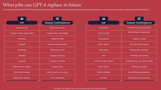 This slide showcases jobs which GPT 4 generative AI technology can replace in todays employment landscape. It provides details about data entry, customer service, proofreading, paralegal, bookkeeping, translator, etc. Take your projects to the next level with our ultimate collection of What Jobs Can GPT 4 Replace In Future GPT 4 Revolutionary Generative AI Innovation Demonstration Pdf. Slidegeeks has designed a range of layouts that are perfect for representing task or activity duration, keeping track of all your deadlines at a glance. Tailor these designs to your exact needs and give them a truly corporate look with your own brand colors they will make your projects stand out from the rest This slide showcases jobs which GPT 4 generative AI technology can replace in todays employment landscape. It provides details about data entry, customer service, proofreading, paralegal, bookkeeping, translator, etc.