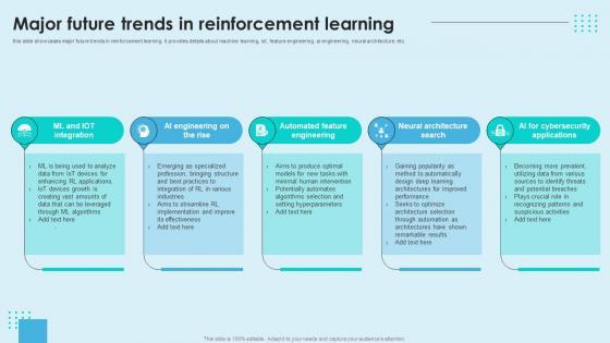 this slide showcases major future trends in reinforcement learning. it provides details about machine learning, iot, feature engineering, ai engineering, neural architecture, etc. The best PPT templates are a great way to save time, energy, and resources. Slidegeeks have 100 percent editable powerpoint slides making them incredibly versatile. With these quality presentation templates, you can create a captivating and memorable presentation by combining visually appealing slides and effectively communicating your message. Download Reinforcement Learning Unveiled Major Future Trends In Reinforcement Learning AI SS V from Slidegeeks and deliver a wonderful presentation. this slide showcases major future trends in reinforcement learning. it provides details about machine learning, iot, feature engineering, ai engineering, neural architecture, etc.