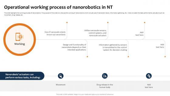 This slide highlights the working process of nanorobotics. The purpose of this slide is to discuss the working of nanorobotics which include use of nanoscale robots, information gathering, etc. It also includes the tasks performed by actuators such as movement, drug release, etc.Presenting this PowerPoint presentation, titled Operational Working Process Building The Future Of Robotic Ppt PowerPoint, with topics curated by our researchers after extensive research. This editable presentation is available for immediate download and provides attractive features when used. Download now and captivate your audience. Presenting this Operational Working Process Building The Future Of Robotic Ppt PowerPoint. Our researchers have carefully researched and created these slides with all aspects taken into consideration. This is a completely customizable Operational Working Process Building The Future Of Robotic Ppt PowerPoint that is available for immediate downloading. Download now and make an impact on your audience. Highlight the attractive features available with our PPTs. This slide highlights the working process of nanorobotics. The purpose of this slide is to discuss the working of nanorobotics which include use of nanoscale robots, information gathering, etc. It also includes the tasks performed by actuators such as movement, drug release, etc.