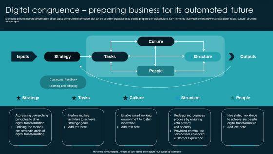Mentioned slide illustrates information about digital congruence framework that can be used by organization to getting prepared for digital future. Key elements involved in the framework are strategy, tasks, culture, structure and people. Explore a selection of the finest Digital Congruence Preparing Business For Its Automated Future Icons PDF here. With a plethora of professionally designed and pre made slide templates, you can quickly and easily find the right one for your upcoming presentation. You can use our Digital Congruence Preparing Business For Its Automated Future Icons PDF to effectively convey your message to a wider audience. Slidegeeks has done a lot of research before preparing these presentation templates. The content can be personalized and the slides are highly editable. Grab templates today from Slidegeeks.