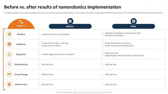 This slide showcases the comparative analysis of the before versus after using nanorobots situation. The purpose of this slide is to showcase the different performance metrics and how nanobots have improved these metrics.Want to ace your presentation in front of a live audience Our Before Vs After Results Of Building The Future Of Robotic Ppt Slide can help you do that by engaging all the users towards you. Slidegeeks experts have put their efforts and expertise into creating these impeccable powerpoint presentations so that you can communicate your ideas clearly. Moreover, all the templates are customizable, and easy-to-edit and downloadable. Use these for both personal and commercial use. This slide showcases the comparative analysis of the before versus after using nanorobots situation. The purpose of this slide is to showcase the different performance metrics and how nanobots have improved these metrics.