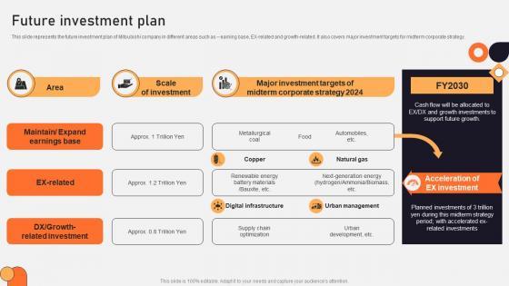 This slide represents the future investment plan of Mitsubishi company in different areas such as earning base, EX-related and growth-related. It also covers major investment targets for midterm corporate strategy. Whether you have daily or monthly meetings, a brilliant presentation is necessary. Future Investment Plan Vehicle Manufacturing Company Profile CP SS V can be your best option for delivering a presentation. Represent everything in detail using Future Investment Plan Vehicle Manufacturing Company Profile CP SS V and make yourself stand out in meetings. The template is versatile and follows a structure that will cater to your requirements. All the templates prepared by Slidegeeks are easy to download and edit. Our research experts have taken care of the corporate themes as well. So, give it a try and see the results. This slide represents the future investment plan of Mitsubishi company in different areas such as earning base, EX-related and growth-related. It also covers major investment targets for midterm corporate strategy.