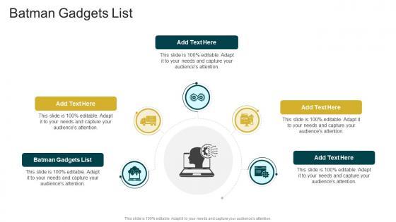 Presenting our innovatively designed set of slides titled Batman Gadgets List In Powerpoint And Google Slides Cpb. This completely editable PowerPoint graphic exhibits Batman Gadgets List that will help you convey the message impactfully. It can be accessed with Google Slides and is available in both standard screen and widescreen aspect ratios. Apart from this, you can download this well structured PowerPoint template design in different formats like PDF, JPG, and PNG. So, click the download button now to gain full access to this PPT design. Our Batman Gadgets List In Powerpoint And Google Slides Cpb are topically designed to provide an attractive backdrop to any subject. Use them to look like a presentation pro.