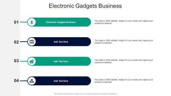 Introducing our well designed Electronic Gadgets Business In Powerpoint And Google Slides Cpb. This PowerPoint design presents information on topics like Electronic Gadgets Business. As it is predesigned it helps boost your confidence level. It also makes you a better presenter because of its high quality content and graphics. This PPT layout can be downloaded and used in different formats like PDF, PNG, and JPG. Not only this, it is available in both Standard Screen and Widescreen aspect ratios for your convenience. Therefore, click on the download button now to persuade and impress your audience. Our Electronic Gadgets Business In Powerpoint And Google Slides Cpb are topically designed to provide an attractive backdrop to any subject. Use them to look like a presentation pro.