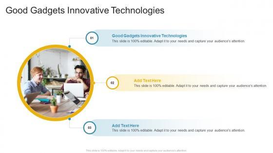Presenting our innovatively-designed set of slides titled Good Gadgets Innovative Technologies In Powerpoint And Google Slides Cpb. This completely editable PowerPoint graphic exhibits Good Gadgets Innovative Technologies that will help you convey the message impactfully. It can be accessed with Google Slides and is available in both standard screen and widescreen aspect ratios. Apart from this, you can download this well-structured PowerPoint template design in different formats like PDF, JPG, and PNG. So, click the download button now to gain full access to this PPT design. Our Good Gadgets Innovative Technologies In Powerpoint And Google Slides Cpb are topically designed to provide an attractive backdrop to any subject. Use them to look like a presentation pro.
