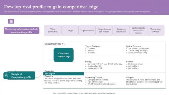 This slide showcases to develop competitors profile to identify potential threats and opportunities. It includes elements such as company name and logo, target audience, reviews, pricing, and marketing tactics. Welcome to our selection of the Develop Rival Profile Gain Competitive Comprehensive Marketing Guide For Tourism Industry Graphics Pdf. These are designed to help you showcase your creativity and bring your sphere to life. Planning and Innovation are essential for any business that is just starting out. This collection contains the designs that you need for your everyday presentations. All of our PowerPoints are 100 percent editable, so you can customize them to suit your needs. This multi purpose template can be used in various situations. Grab these presentation templates today This slide showcases to develop competitors profile to identify potential threats and opportunities. It includes elements such as company name and logo, target audience, reviews, pricing, and marketing tactics.