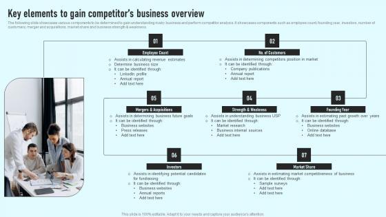 The following slide showcases various components to be determined to gain understanding rivalry business and perform competitor analysis. It showcases components such as employee count, founding year, investors, number of customers, merger and acquisitions, market share and business strength and weakness. Take your projects to the next level with our ultimate collection of Key Elements To Gain Competitors Business Overview Comprehensive Guide Introduction Pdf Slidegeeks has designed a range of layouts that are perfect for representing task or activity duration, keeping track of all your deadlines at a glance. Tailor these designs to your exact needs and give them a truly corporate look with your own brand colors they well make your projects stand out from the rest. The following slide showcases various components to be determined to gain understanding rivalry business and perform competitor analysis. It showcases components such as employee count, founding year, investors, number of customers, merger and acquisitions, market share and business strength and weakness.