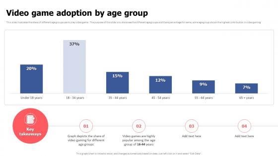 This slide illustrates the share of different age groups use to play video game. The purpose of this slide is to showcase the different age groups and there percentage for same, some age group shown the highest contribution in video gaming. The best PPT templates are a great way to save time, energy, and resources. Slidegeeks have 100 percent editable powerpoint slides making them incredibly versatile. With these quality presentation templates, you can create a captivating and memorable presentation by combining visually appealing slides and effectively communicating your message. Download Video Game Adoption By Age Group Video Game Financing Pitch Deck from Slidegeeks and deliver a wonderful presentation. This slide illustrates the share of different age groups use to play video game. The purpose of this slide is to showcase the different age groups and there percentage for same, some age group shown the highest contribution in video gaming.