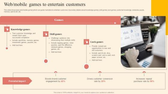 This slide showcases web or mobile games which can guide marketers to entertain customers. It provides details about knowledge games, skill games, luck games, customer knowledge, obstacles, puzzle, memory, spin and win, etc. Slidegeeks has constructed Web Mobile Games To Entertain Customers Information PDF after conducting extensive research and examination. These presentation templates are constantly being generated and modified based on user preferences and critiques from editors. Here, you will find the most attractive templates for a range of purposes while taking into account ratings and remarks from users regarding the content. This is an excellent jumping off point to explore our content and will give new users an insight into our top notch PowerPoint Templates.