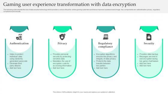 The following slide exhibits the role of data security technology which provides a sense of trust for online gaming customers and hence improves business brand image . Key components are authentication, privacy, regulatory compliance and security. Pitch your topic with ease and precision using this Gaming User Experience Transformation With Data Encryption Portrait Pdf. This layout presents information on Authentication, Privacy, Regulatory Compliance. It is also available for immediate download and adjustment. So, changes can be made in the color, design, graphics or any other component to create a unique layout. The following slide exhibits the role of data security technology which provides a sense of trust for online gaming customers and hence improves business brand image . Key components are authentication, privacy, regulatory compliance and security.