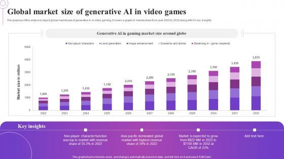 The purpose of this slide is to depict global market size of generative AI in video gaming. It covers a graph of market share from year 2022 to 2032 along with its key insights. Showcasing this set of slides titled Global Market Size Of Generative AI In Video Games Icons Pdf The topics addressed in these templates are Market Revenue, Pacific Dominated, Market Expected Grow All the content presented in this PPT design is completely editable. Download it and make adjustments in color, background, font etc. as per your unique business setting. The purpose of this slide is to depict global market size of generative AI in video gaming. It covers a graph of market share from year 2022 to 2032 along with its key insights.