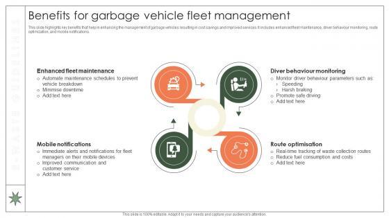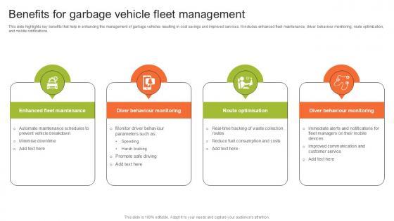 This slide highlights key benefits that help in enhancing the management of garbage vehicles resulting in cost savings and improved services. It includes enhanced fleet maintenance, driver behaviour monitoring, route optimization, and mobile notifications. Want to ace your presentation in front of a live audience Our Benefits For Garbage Vehicle Fleet Management Implementation Of E Waste Guidelines can help you do that by engaging all the users towards you. Slidegeeks experts have put their efforts and expertise into creating these impeccable powerpoint presentations so that you can communicate your ideas clearly. Moreover, all the templates are customizable, and easy-to-edit and downloadable. Use these for both personal and commercial use. This slide highlights key benefits that help in enhancing the management of garbage vehicles resulting in cost savings and improved services. It includes enhanced fleet maintenance, driver behaviour monitoring, route optimization, and mobile notifications.