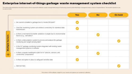 The below slide exhibits the checklist of various items required for effective waste management using IoT technology-based system that helps managers to keep a check of required items. The result is based on yes, no and, on hold. Pitch your topic with ease and precision using this Enterprise Internet Of Things Garbage Waste Management System Checklist Template Pdf. This layout presents information on Multiple Factors, Sensitive Data, Connectivity Components. It is also available for immediate download and adjustment. So, changes can be made in the color, design, graphics or any other component to create a unique layout. The below slide exhibits the checklist of various items required for effective waste management using IoT technology-based system that helps managers to keep a check of required items. The result is based on yes, no and, on hold.