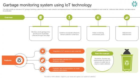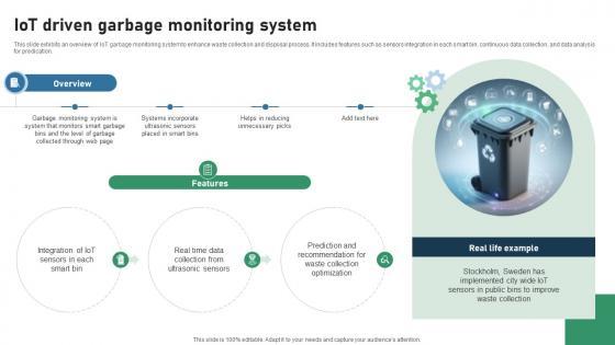 This slide exhibits an overview of IoT garbage monitoring system to enhance waste collection and disposal process. It includes features such as sensors integration in each smart bin, continuous data collection, and data analysis for predication. The best PPT templates are a great way to save time, energy, and resources. Slidegeeks have 100 percent editable powerpoint slides making them incredibly versatile. With these quality presentation templates, you can create a captivating and memorable presentation by combining visually appealing slides and effectively communicating your message. Download IOT Driven Garbage Monitoring System IOT Applications In Smart Waste IoT SS V from Slidegeeks and deliver a wonderful presentation. This slide exhibits an overview of IoT garbage monitoring system to enhance waste collection and disposal process. It includes features such as sensors integration in each smart bin, continuous data collection, and data analysis for predication.