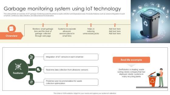 This slide exhibits an overview of IoT garbage monitoring system to enhance waste collection and disposal process. It includes features such as sensors integration in each smart bin, continuous data collection, and data analysis for predication. Whether you have daily or monthly meetings, a brilliant presentation is necessary. Garbage Monitoring System Step By Step Guide For Electronic Ppt Presentation can be your best option for delivering a presentation. Represent everything in detail using Garbage Monitoring System Step By Step Guide For Electronic Ppt Presentation and make yourself stand out in meetings. The template is versatile and follows a structure that will cater to your requirements. All the templates prepared by Slidegeeks are easy to download and edit. Our research experts have taken care of the corporate themes as well. So, give it a try and see the results. This slide exhibits an overview of IoT garbage monitoring system to enhance waste collection and disposal process. It includes features such as sensors integration in each smart bin, continuous data collection, and data analysis for predication.