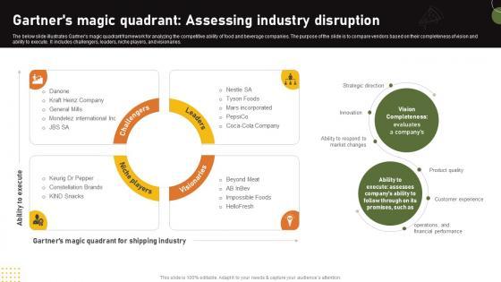 The below slide illustrates Gartners magic quadrant framework for analyzing the competitive ability of food and beverage companies. The purpose of the slide is to compare vendors based on their completeness of vision and ability to execute. It includes challengers, leaders, niche players, and visionaries. Whether you have daily or monthly meetings, a brilliant presentation is necessary. Food And Drink Industry Report Gartners Magic Quadrant Assessing Industry Disruption IR SS V can be your best option for delivering a presentation. Represent everything in detail using Food And Drink Industry Report Gartners Magic Quadrant Assessing Industry Disruption IR SS V and make yourself stand out in meetings. The template is versatile and follows a structure that will cater to your requirements. All the templates prepared by Slidegeeks are easy to download and edit. Our research experts have taken care of the corporate themes as well. So, give it a try and see the results. The below slide illustrates Gartners magic quadrant framework for analyzing the competitive ability of food and beverage companies. The purpose of the slide is to compare vendors based on their completeness of vision and ability to execute. It includes challengers, leaders, niche players, and visionaries.