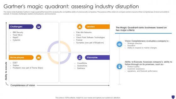 The below slide illustrates Gartners magic quadrant framework for analyzing the competitive ability of cybersecurity companies. The purpose of the slide is to compare vendors based on their completeness of vision and ability to execute. It includes challengers, leaders, niche players, and visionaries. Find highly impressive Global Data Security Industry Report Gartners Magic Quadrant Assessing Industry Disruption IR SS V on Slidegeeks to deliver a meaningful presentation. You can save an ample amount of time using these presentation templates. No need to worry to prepare everything from scratch because Slidegeeks experts have already done a huge research and work for you. You need to download Global Data Security Industry Report Gartners Magic Quadrant Assessing Industry Disruption IR SS V for your upcoming presentation. All the presentation templates are 100 percent editable and you can change the color and personalize the content accordingly. Download now The below slide illustrates Gartners magic quadrant framework for analyzing the competitive ability of cybersecurity companies. The purpose of the slide is to compare vendors based on their completeness of vision and ability to execute. It includes challengers, leaders, niche players, and visionaries.
