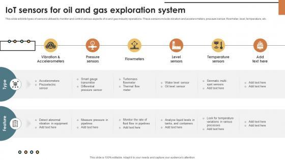 This slide exhibits types of sensors utilised to monitor and control various aspects of oi and gas industry operations. These sensors include vibration and accelerometers, pressure sensor, flowmeter, level, temperature, etc. Slidegeeks has constructed IoT Solutions For Oil IoT Sensors For Oil And Gas Exploration System IoT SS V after conducting extensive research and examination. These presentation templates are constantly being generated and modified based on user preferences and critiques from editors. Here, you will find the most attractive templates for a range of purposes while taking into account ratings and remarks from users regarding the content. This is an excellent jumping-off point to explore our content and will give new users an insight into our top-notch PowerPoint Templates. This slide exhibits types of sensors utilised to monitor and control various aspects of oi and gas industry operations. These sensors include vibration and accelerometers, pressure sensor, flowmeter, level, temperature, etc.