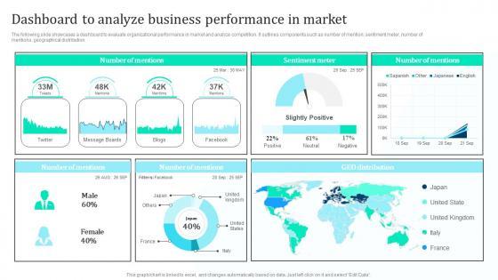 The following slide showcases a dashboard to evaluate organizational performance in market and analyze competition. It outlines components such as number of mention, sentiment meter, number of mentions, geographical distribution. Do you have to make sure that everyone on your team knows about any specific topic I yes, then you should give Dashboard Analyze Business Performance Marketing Intelligence Guide Data Gathering Microsoft Pdf a try. Our experts have put a lot of knowledge and effort into creating this impeccable Dashboard Analyze Business Performance Marketing Intelligence Guide Data Gathering Microsoft Pdf. You can use this template for your upcoming presentations, as the slides are perfect to represent even the tiniest detail. You can download these templates from the Slidegeeks website and these are easy to edit. So grab these today The following slide showcases a dashboard to evaluate organizational performance in market and analyze competition. It outlines components such as number of mention, sentiment meter, number of mentions, geographical distribution.