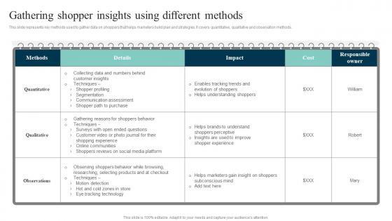 This slide represents key methods used to gather data on shoppers that helps marketers build plan and strategies. It covers quantitative, qualitative and observation methods. From laying roadmaps to briefing everything in detail, our templates are perfect for you. You can set the stage with your presentation slides. All you have to do is download these easy-to-edit and customizable templates. Gathering Shopper Insights Using Different Methods Optimizing Customer Purchase Experience By Executing Topics PDF will help you deliver an outstanding performance that everyone would remember and praise you for. Do download this presentation today.