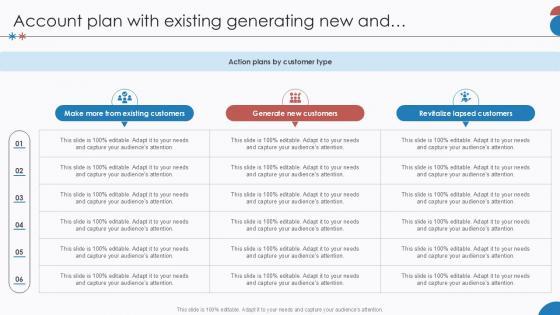 Want to ace your presentation in front of a live audience Our Account Plan With Existing Generating New And PPT Example SS can help you do that by engaging all the users towards you. Slidegeeks experts have put their efforts and expertise into creating these impeccable powerpoint presentations so that you can communicate your ideas clearly. Moreover, all the templates are customizable, and easy-to-edit and downloadable. Use these for both personal and commercial use. Our Account Plan With Existing Generating New And PPT Example SS are topically designed to provide an attractive backdrop to any subject. Use them to look like a presentation pro.