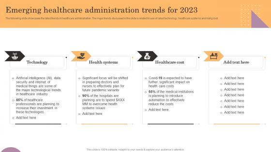 The following slide showcases the latest trends in healthcare administration. The major trends discussed in the slide is related to use of latest technology, healthcare systems and rising cost. Crafting an eye-catching presentation has never been more straightforward. Let your presentation shine with this tasteful yet straightforward Emerging Healthcare Administration Trends For 2023 General Management Clipart Pdf template. It offers a minimalistic and classy look that is great for making a statement. The colors have been employed intelligently to add a bit of playfulness while still remaining professional. Construct the ideal Emerging Healthcare Administration Trends For 2023 General Management Clipart Pdf that effortlessly grabs the attention of your audience Begin now and be certain to wow your customers The following slide showcases the latest trends in healthcare administration. The major trends discussed in the slide is related to use of latest technology, healthcare systems and rising cost.