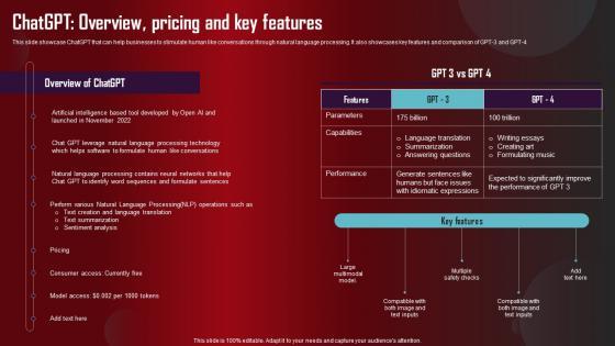 This slide showcase ChatGPT that can help businesses to stimulate human like conversations through natural language processing. It also showcases key features and comparison of GPT 3 and GPT 4 Do you have to make sure that everyone on your team knows about any specific topic I yes, then you should give ChatGPT Overview Pricing And Key Role Of Generative AI Tools Across Structure Pdf a try. Our experts have put a lot of knowledge and effort into creating this impeccable ChatGPT Overview Pricing And Key Role Of Generative AI Tools Across Structure Pdf. You can use this template for your upcoming presentations, as the slides are perfect to represent even the tiniest detail. You can download these templates from the Slidegeeks website and these are easy to edit. So grab these today. This slide showcase ChatGPT that can help businesses to stimulate human like conversations through natural language processing. It also showcases key features and comparison of GPT 3 and GPT 4