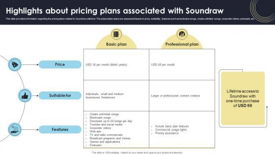 This slide provides information regarding the pricing plans related to Soundraw platform. The subscription plans are assessed based on price, suitability, features such as bookmark songs, create unlimited songs, corporate videos, podcasts, etc. Presenting this PowerPoint presentation, titled Highlights About Pricing Plans Associated With How Generative AI Tools Work AI SS V, with topics curated by our researchers after extensive research. This editable presentation is available for immediate download and provides attractive features when used. Download now and captivate your audience. Presenting this Highlights About Pricing Plans Associated With How Generative AI Tools Work AI SS V. Our researchers have carefully researched and created these slides with all aspects taken into consideration. This is a completely customizable Highlights About Pricing Plans Associated With How Generative AI Tools Work AI SS V that is available for immediate downloading. Download now and make an impact on your audience. Highlight the attractive features available with our PPTs. This slide provides information regarding the pricing plans related to Soundraw platform. The subscription plans are assessed based on price, suitability, features such as bookmark songs, create unlimited songs, corporate videos, podcasts, etc.