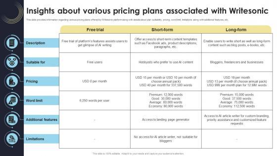 This slide provides information regarding various pricing plans offered by Writesonic platform along with details about plan suitability, pricing, word limit, limitations along with additional features, etc. Do you have to make sure that everyone on your team knows about any specific topic I yes, then you should give Insights About Various Pricing Plans Associated How Generative AI Tools Work AI SS V a try. Our experts have put a lot of knowledge and effort into creating this impeccable Insights About Various Pricing Plans Associated How Generative AI Tools Work AI SS V. You can use this template for your upcoming presentations, as the slides are perfect to represent even the tiniest detail. You can download these templates from the Slidegeeks website and these are easy to edit. So grab these today This slide provides information regarding various pricing plans offered by Writesonic platform along with details about plan suitability, pricing, word limit, limitations along with additional features, etc.