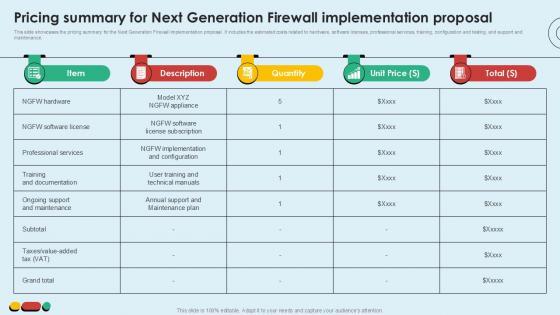 This slide showcases the pricing summary for the Next Generation Firewall implementation proposal. It includes the estimated costs related to hardware, software licenses, professional services, training, configuration and testing, and support and maintenance.Find highly impressive Pricing Summary For Next Generation Intelligent Intrusion Prevention System Ppt Sample on Slidegeeks to deliver a meaningful presentation. You can save an ample amount of time using these presentation templates. No need to worry to prepare everything from scratch because Slidegeeks experts have already done a huge research and work for you. You need to download Pricing Summary For Next Generation Intelligent Intrusion Prevention System Ppt Sample for your upcoming presentation. All the presentation templates are 100 percent editable and you can change the color and personalize the content accordingly. Download now This slide showcases the pricing summary for the Next Generation Firewall implementation proposal. It includes the estimated costs related to hardware, software licenses, professional services, training, configuration and testing, and support and maintenance.