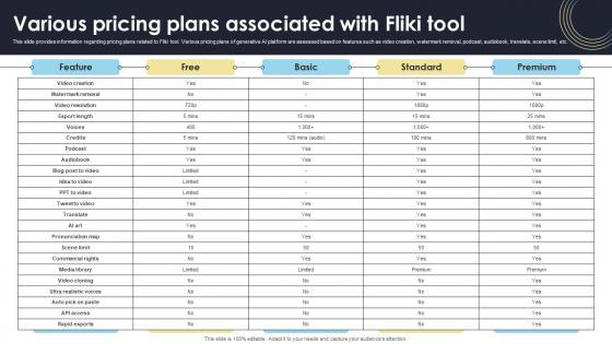 This slide provides information regarding pricing plans related to Fliki tool. Various pricing plans of generative AI platform are assessed based on features such as video creation, watermark removal, podcast, audiobook, translate, scene limit, etc. Retrieve professionally designed Various Pricing Plans Associated With Fliki Tool How Generative AI Tools Work AI SS V to effectively convey your message and captivate your listeners. Save time by selecting pre-made slideshows that are appropriate for various topics, from business to educational purposes. These themes come in many different styles, from creative to corporate, and all of them are easily adjustable and can be edited quickly. Access them as PowerPoint templates or as Google Slides themes. You do not have to go on a hunt for the perfect presentation because Slidegeeks got you covered from everywhere. This slide provides information regarding pricing plans related to Fliki tool. Various pricing plans of generative AI platform are assessed based on features such as video creation, watermark removal, podcast, audiobook, translate, scene limit, etc.