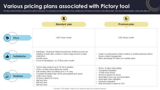 This slide provides information regarding Pictory platform pricing plans. The pricing plans are analyzed based on prices, suitability along with features such as text-to-video editing duration, music tracks, branded templates, existing video editing, etc. Slidegeeks has constructed Various Pricing Plans Associated With Pictory Tool How Generative AI Tools Work AI SS V after conducting extensive research and examination. These presentation templates are constantly being generated and modified based on user preferences and critiques from editors. Here, you will find the most attractive templates for a range of purposes while taking into account ratings and remarks from users regarding the content. This is an excellent jumping-off point to explore our content and will give new users an insight into our top-notch PowerPoint Templates. This slide provides information regarding Pictory platform pricing plans. The pricing plans are analyzed based on prices, suitability along with features such as text-to-video editing duration, music tracks, branded templates, existing video editing, etc.