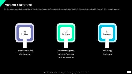 This slide caters to details about several problems in the market faced by prospects. These pain points are retargeting awareness, technological challenges, and multiple platforms for different retargeting options. Present like a pro with Search Retargeting And Lead Generation Company Elevator Pitch Deck Problem Statement Graphics PDF Create beautiful presentations together with your team, using our easy to use presentation slides. Share your ideas in real time and make changes on the fly by downloading our templates. So whether you are in the office, on the go, or in a remote location, you can stay in sync with your team and present your ideas with confidence. With Slidegeeks presentation got a whole lot easier. Grab these presentations today.