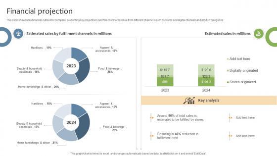 This slide showcases financial outlook for company, presenting key projections and forecasts for revenue from different channels such as stores and digital channels and product categories. This Financial Projection General Merchandising Store Business Model BMC SS V is perfect for any presentation, be it in front of clients or colleagues. It is a versatile and stylish solution for organizing your meetings. The Financial Projection General Merchandising Store Business Model BMC SS V features a modern design for your presentation meetings. The adjustable and customizable slides provide unlimited possibilities for acing up your presentation. Slidegeeks has done all the homework before launching the product for you. So, do not wait, grab the presentation templates today This slide showcases financial outlook for company, presenting key projections and forecasts for revenue from different channels such as stores and digital channels and product categories.