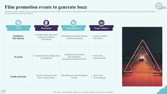 The following slide highlights various marketing events used to promote The Blair Witch Project among industry insiders, film critics, genre fans and general public. It showcases key components such as events, details, marketing objectives and target audience. Formulating a presentation can take up a lot of effort and time, so the content and message should always be the primary focus. The visuals of the PowerPoint can enhance the presenters message, so our Marketing Channels For Movie Film Promotion Events To Generate Buzz Strategy SS V was created to help save time. Instead of worrying about the design, the presenter can concentrate on the message while our designers work on creating the ideal templates for whatever situation is needed. Slidegeeks has experts for everything from amazing designs to valuable content, we have put everything into Marketing Channels For Movie Film Promotion Events To Generate Buzz Strategy SS V. The following slide highlights various marketing events used to promote The Blair Witch Project among industry insiders, film critics, genre fans and general public. It showcases key components such as events, details, marketing objectives and target audience.