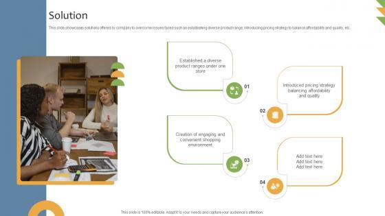 This slide showcases solutions offered by company to overcome issues faced such as establishing diverse product range, introducing pricing strategy to balance affordability and quality, etc. Here you can discover an assortment of the finest PowerPoint and Google Slides templates. With these templates, you can create presentations for a variety of purposes while simultaneously providing your audience with an eye-catching visual experience. Download Solution General Merchandising Store Business Model BMC SS V to deliver an impeccable presentation. These templates will make your job of preparing presentations much quicker, yet still, maintain a high level of quality. Slidegeeks has experienced researchers who prepare these templates and write high-quality content for you. Later on, you can personalize the content by editing the Solution General Merchandising Store Business Model BMC SS V. This slide showcases solutions offered by company to overcome issues faced such as establishing diverse product range, introducing pricing strategy to balance affordability and quality, etc.