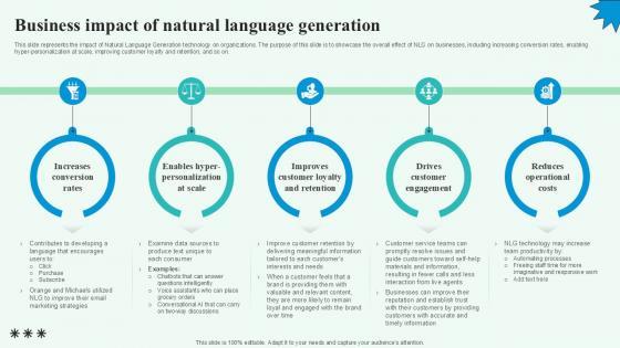 This slide represents the impact of Natural Language Generation technology on organizations. The purpose of this slide is to showcase the overall effect of NLG on businesses, including increasing conversion rates, enabling hyper-personalization at scale, improving customer loyalty and retention, and so on. Present like a pro with Business Impact Of Natural Automated Content Generation PPT Example. Create beautiful presentations together with your team, using our easy-to-use presentation slides. Share your ideas in real-time and make changes on the fly by downloading our templates. So whether you are in the office, on the go, or in a remote location, you can stay in sync with your team and present your ideas with confidence. With Slidegeeks presentation got a whole lot easier. Grab these presentations today. This slide represents the impact of Natural Language Generation technology on organizations. The purpose of this slide is to showcase the overall effect of NLG on businesses, including increasing conversion rates, enabling hyper-personalization at scale, improving customer loyalty and retention, and so on.